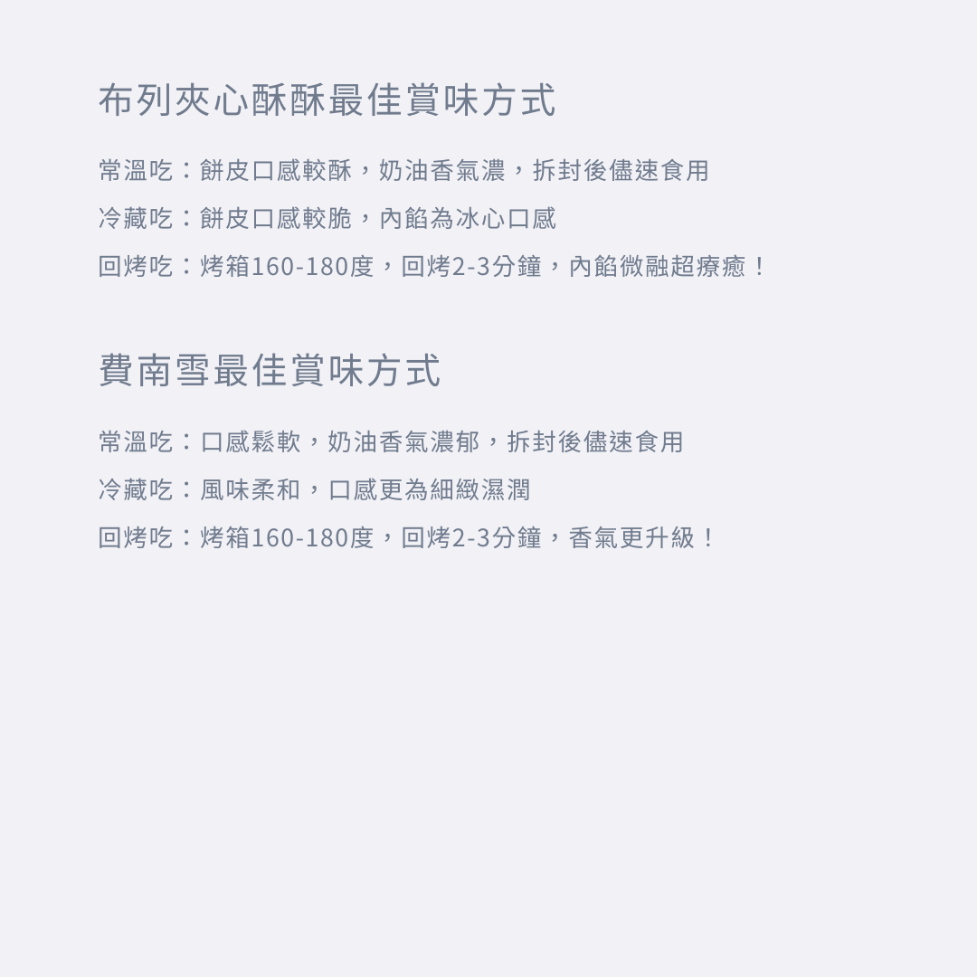 布列夾心酥酥:常溫保存25天/ 冷藏保存45天(常溫:25度C以下,避免陽光直射與接近熱源)