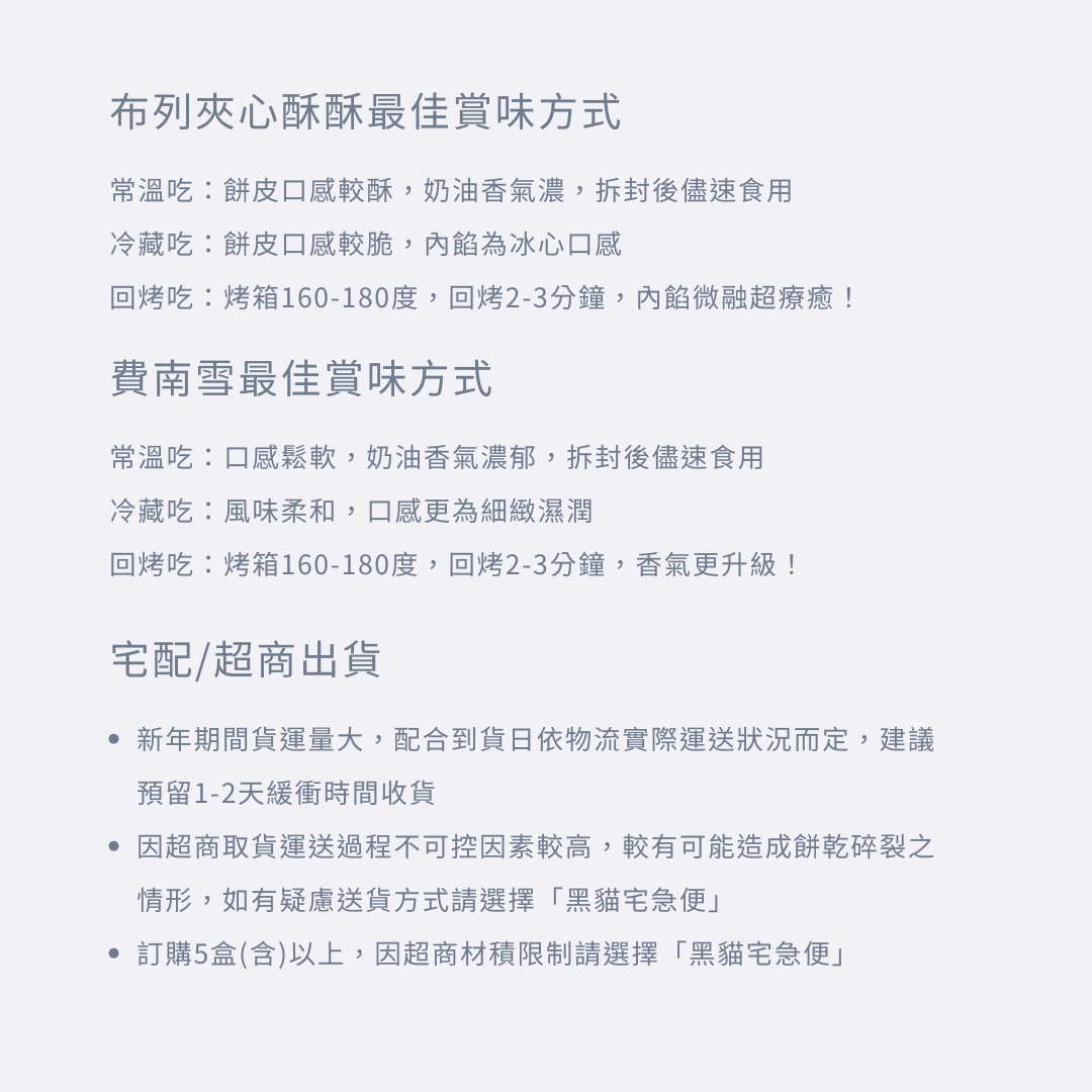 布列夾心酥酥:常溫保存25天/ 冷藏保存45天(常溫:25度C以下,避免陽光直射與接近熱源)